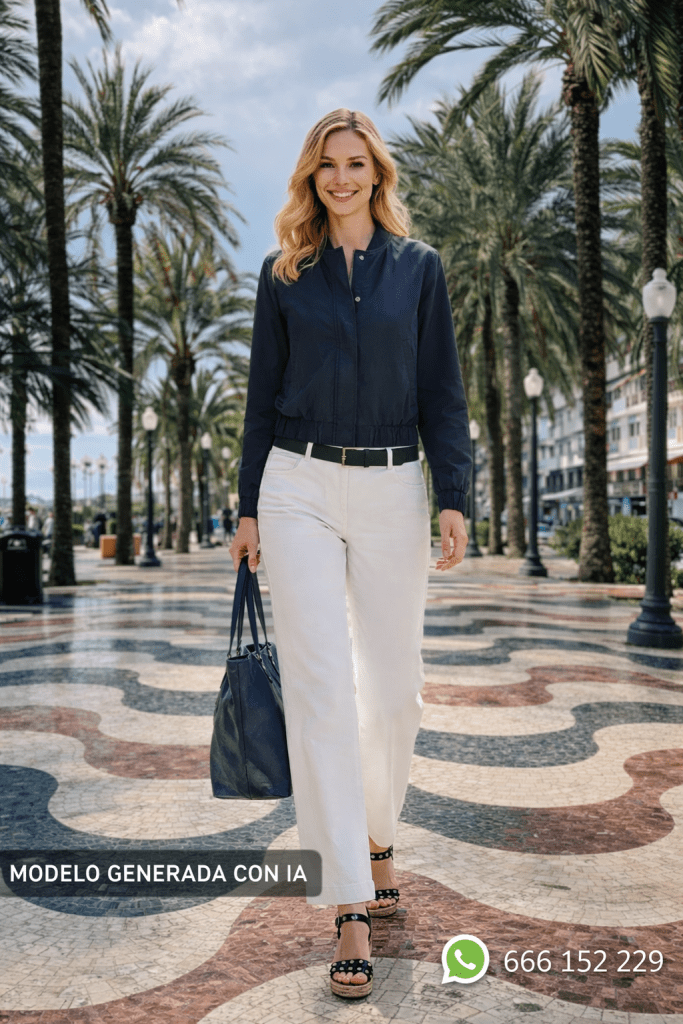 Look azul marino y blanco es de esos combos que funcionan aunque no tengas tiempo, aunque no te apetezca pensar demasiado y aunque el día sea largo. En la imagen, la modelo camina por un paseo de aire mediterráneo con palmeras y suelo ondulado, y el estilismo se entiende al primer vistazo: limpio, favorecedor y con ese punto de “voy bien vestida sin intentarlo” que engancha.